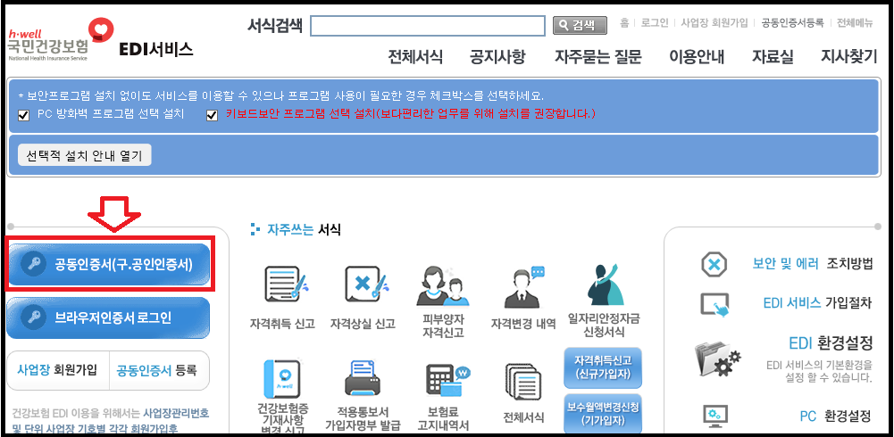 국민건강보험 EDI에 접속하여 공동인증서(공인인증서)로 로그인해주세요.