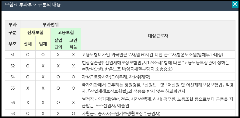부과부호구분은 대상근로자 중 내용에 해당하는 근로자가 있는 경우 맨 앞에 적혀있는 숫자 부호를 입력해주시면 됩니다. (예시: 차상위계층일 경우 54, 국민기초생활보장수급권자일 경우 58) 해당사항이 없는 경우 비워두시고 진행하시면 됩니다.