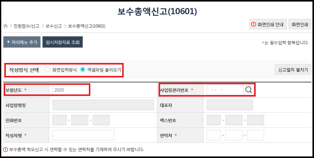 저는 인원이 몇 명 안돼서 화면입력방식으로 진행하였습니다. 보험년도를 한번 체크 후 사업장관리번호 옆 돋보기를 클릭하여 사업장을 선택해주세요. 아래 작성자명, 연락처를 입력해주세요.