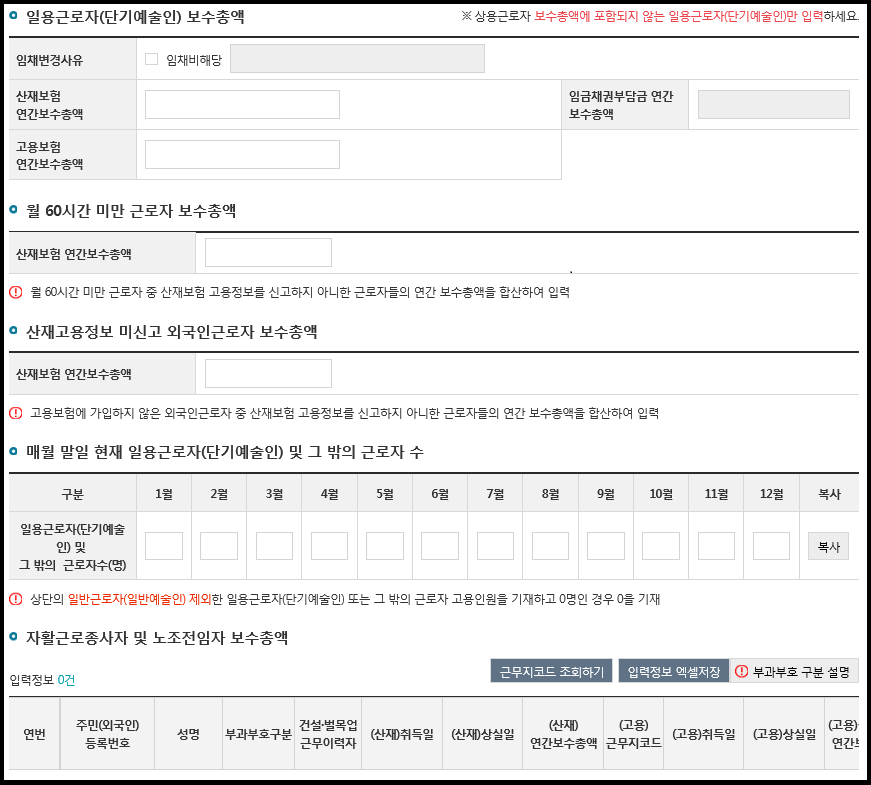 상단에 보수총액신고 대상 근로자가 없는 경우엔 체크박스를 선택하시고 접수하시면 됩니다.