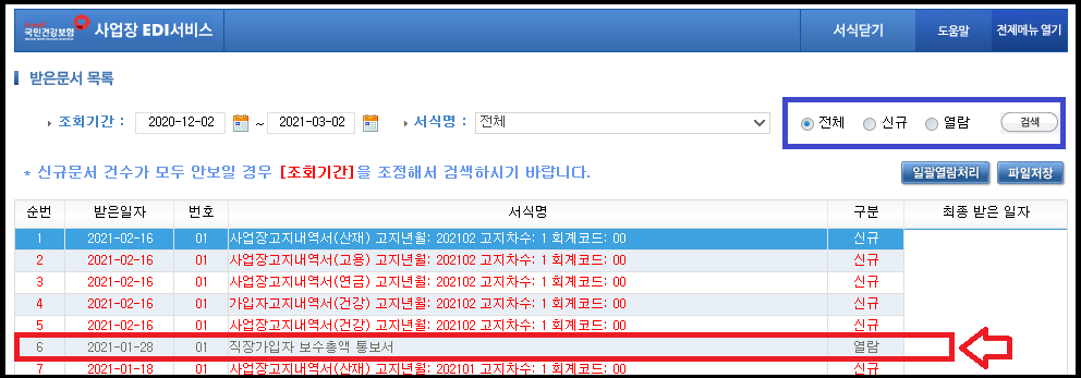 문서 파일 중에 직장가입자 보수총액 통보서를 클릭해주세요. 이미 한번 열람했을 경우 조회가 안될 수도 있습니다. 파란색 박스에 표시한 '전체'를 클릭하여 검색해주세요.