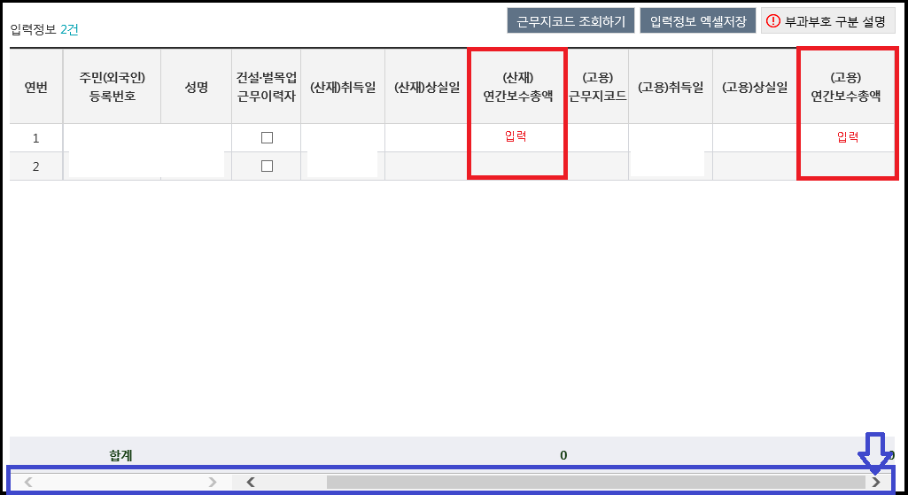 아래 스크롤바 또는 화살표를 눌러 옆으로 이동하시면 산재 연간보수총액, 고용 연간보수총액을 입력하는 칸이 보입니다. 위에 건강보험 보수총액신고를 했던 것처럼 원천징수영수증을 참고하여 보수총액을 입력해주시면 됩니다.