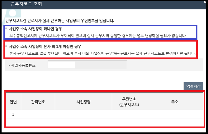근무지코드는 사업장이 본사외 1개 이상일경우 경우 회색박스에 근무지코드 조회하기를 클릭하면 선택할 수 있습니다.