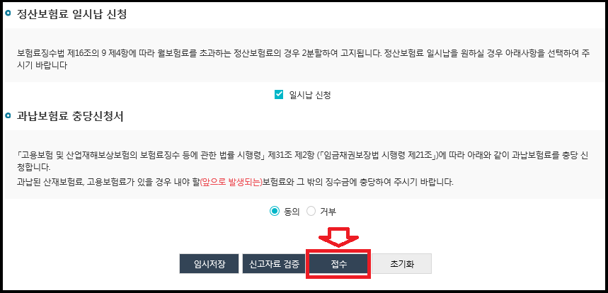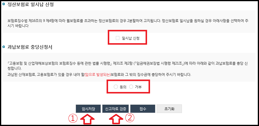 과납보험료 충당신청서는 과납된 산재,고용 보험료가 있는 경우 앞으로 낼 보험료에서 징수 or 충당할지 동의 또는 거부를 체크해주시면 됩니다. 체크가 끝나면 임시저장 버튼을 누른 후 신고자료 검증을 클릭해주세요.
