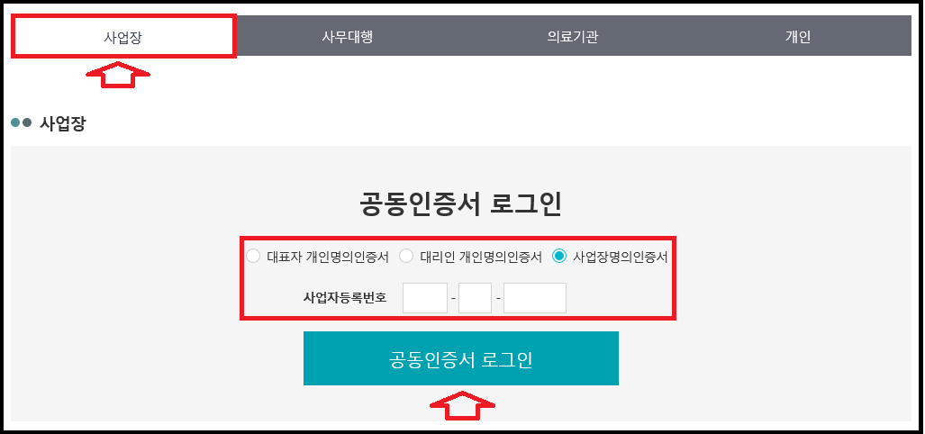 사업장을 클릭 후 사업장명의인증서 클릭, 사업자등록번호를 입력 후 인증서로 로그인해주세요.