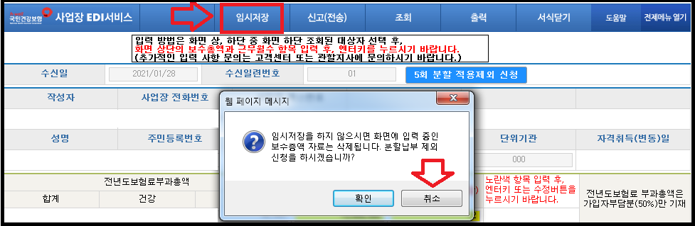 이 부분은 분할 신청하실 경우만 참고해주세요. 보수총액을 작성중에 클릭했더니 임시 저장하지 않으면 입력한 자료가 삭제된다고 합니다. 취소를 누른 후 상단에 임시저장을 클릭해주세요.