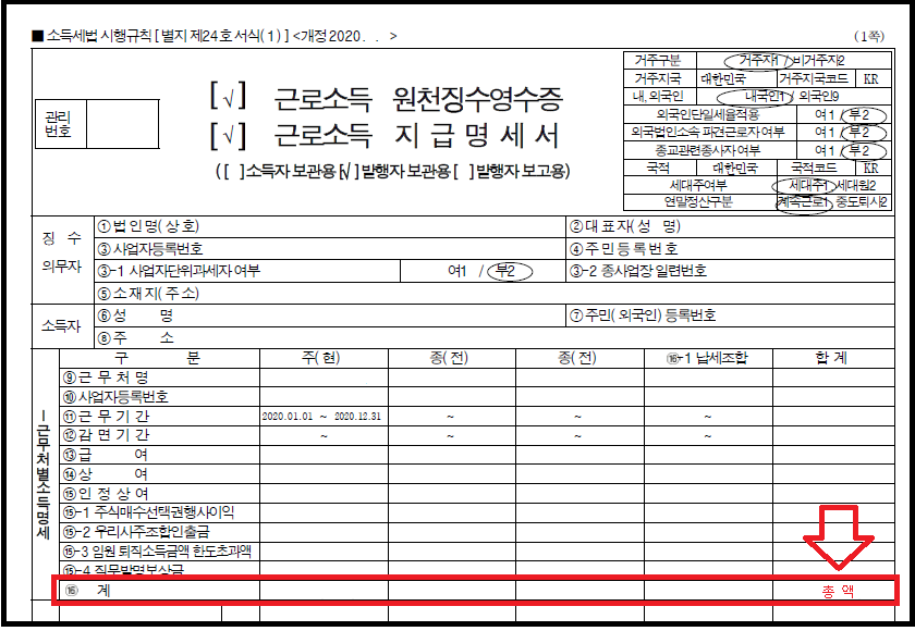 저는 2020년 귀속분 근로소득 원천징수영수증을 참고하여 보수총액 신고를 했습니다. 화살표로 표시한 총액을 입력해주시면 됩니다. 근무월수도 나와있는 근무기간을 참고하시면 됩니다.