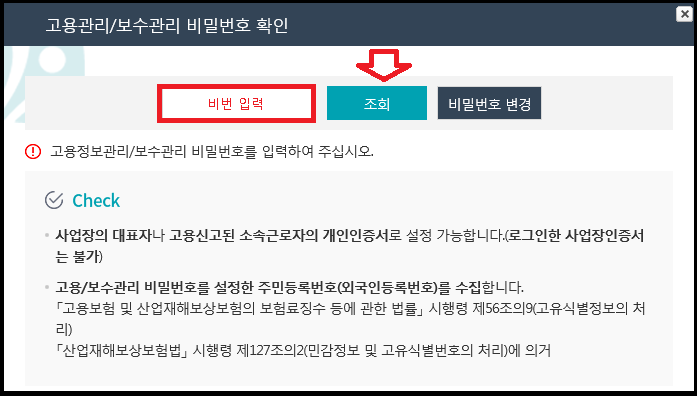 고용관리/보수관리 비밀번호를 아는 경우 비번을 입력 후 조회를 클릭해주세요. 비밀번호를 잊어버렸을 경우 오른쪽 비밀번호 변경을 클릭하여 변경하실 수 있습니다.