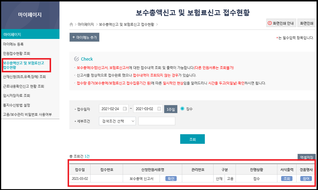 마이페이지에서 왼쪽 보수총액신고 및 보험료신고 접수현황을 클릭하시면 접수가 잘 되었는지 확인이 가능하고 진행상황을 알 수 있습니다. 현재는 접수된 상태이며 추후 잘 처리되는 것까지 체크하시면 됩니다.
