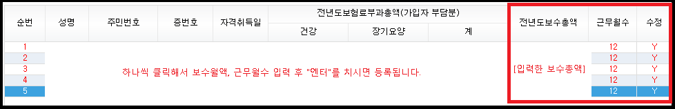 한 명씩 클릭해서 보수월액, 근무월수를 입력 후 엔터를 치시면 하단에 전년도보수총액과 근무월수가 입력되며 수정 부분에 Y로 표시가 됩니다. 빨간박스 표시한 부분입니다.
