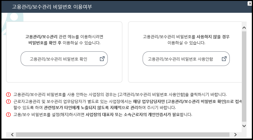 고용관리/보수관리 비번을 아는 경우 왼쪽, 고용관리/보수관리 비밀번호를 사용하지 않을 경우 오른쪽을 클릭해주세요.
