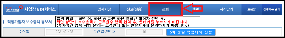다시 초기화면에서 직장가입자 보수총액 통보 문서를 클릭하여 들어와서 조회를 클릭해주세요.