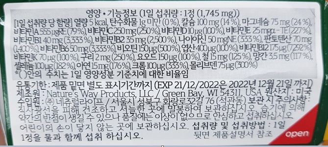짜잔~제가 구입한 얼라이브 원스데일리 멀티비타민 세트입니다. 60정짜리가 2통이 들어있어요. 인터넷으로 구입했고, 2021년 2월 9일에 구입했는데 명절 전이라 행사를 해서 그런지 35,520원에 조금 저렴한 가격에 구입했습니다. 복용한지는 구입 시기로 보니 약 한 달 정도 되었네요. 1일 1정만 복용하면 돼서 좋습니다. 유통기한은 2022.08.31까지 입니다.